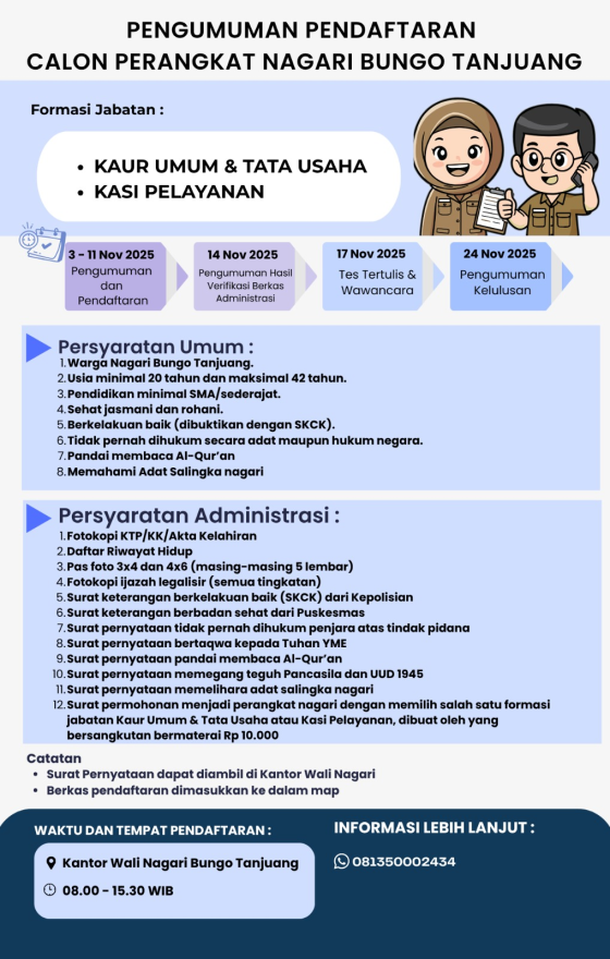 Bungo Tanjuang, Jumat, 4 Juli 2025 – Pemerintah Nagari Bungo Tanjuang bersama Badan Permusyawaratan Rakyat Nagari (BPRN) telah melaksanakan kegiatan Musyawarah Nagari dalam rangka pergantian Keluarga Penerima Manfaat (KPM) Bantuan Langsung Tunai (BLT) Dana Desa Tahun 2025, yang diselenggarakan pada hari Jumat, 4 Juli 2025, bertempat di Aula KAN (Kerapatan Adat Nagari) Bungo Tanjuang.