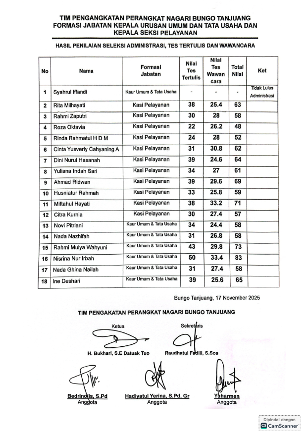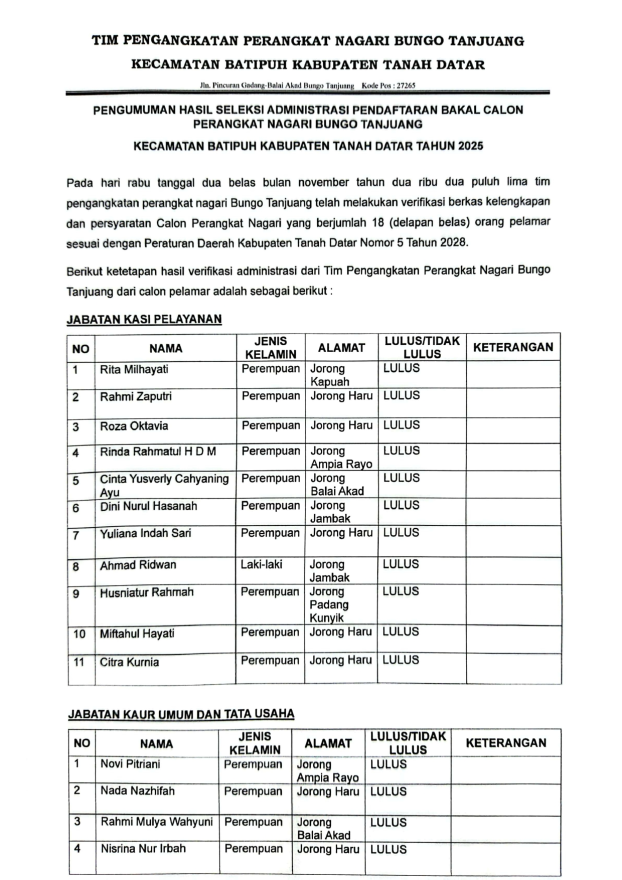 Keputusan hasil musyawarah dituangkan dalam berita acara resmi sebagai dasar administrasi untuk pelaksanaan penyaluran BLT Dana Desa pada periode selanjutnya. Pemerintah Nagari Bungo Tanjuang berkomitmen menjaga integritas dan keadilan dalam pelaksanaan program bantuan sosial bagi masyarakat yang benar-benar membutuhkan.